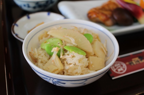 “炊き込みご飯”はタケノコとそら豆の炊き込みご飯に桜エビを散らしました。半月型のタケノコで、伊達政宗のトレードマークである“三日月の兜”を、そら豆で独眼竜所以の“眼帯”をイメージしたそうです( *´艸`)