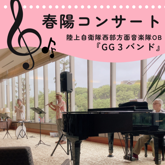 当日は天気も良く、熊本城を望むラウンジは春の陽気に包まれて最高のステージとなりました✨最後には“ふるさと”の演奏に合わせてご入居者の皆様も一緒に歌われ、楽しい時間となりました♪次のイベントも楽しみですね☺