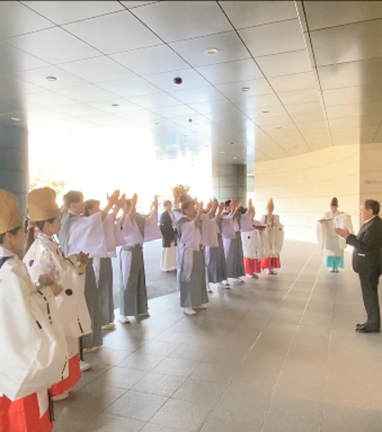 本日は、その『御神幸行列』 がグランガーデン熊本にも来てくださり、“福拍子”で商売繁盛を祈願してくださいました!